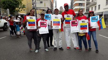 En la Plaza Diego O'Leary, donde desembocaría la marcha procedente de Plaza Sucre, en el oeste, los asistentes gritaban consignas como "No más Trump en Venezuela, saca tus manos de ella" y bailaban al ritmo de grupos musicales.