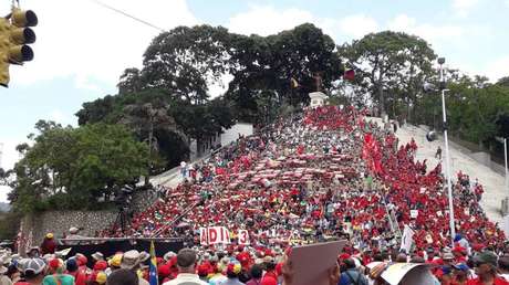 En las escaleras de El Calvario, un centenario paseo capitalino ubicado en una colina, una formación de integrantes de la Milicia Nacional Bolivariana y personas de movimientos sociales portaba banderas de Venezuela y afiches en contra de Trump que el lunes firmó una orden ejecutiva que congela todos los activos del Gobierno de Venezuela en su país y prohíbe las transacciones con él, medida que incrementa de forma significativa la presión contra Caracas y supone un paso hacia un embargo total.