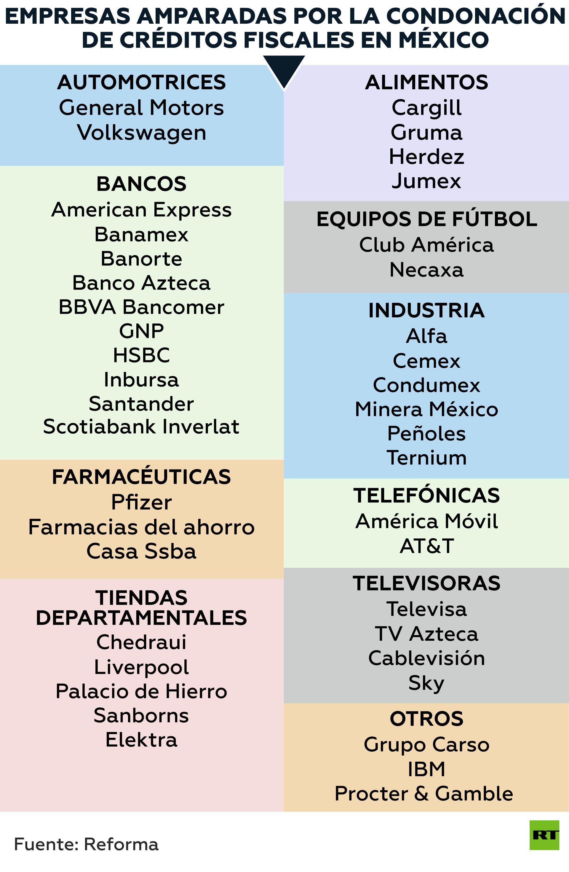 Entre las empresas amparadas para no revelar los montos de sus condonaciones figuran los principales bancos, televisoras, farmacéuticas, empresas automotrices, mineras, tiendas departamentales y hasta equipos de futbol.