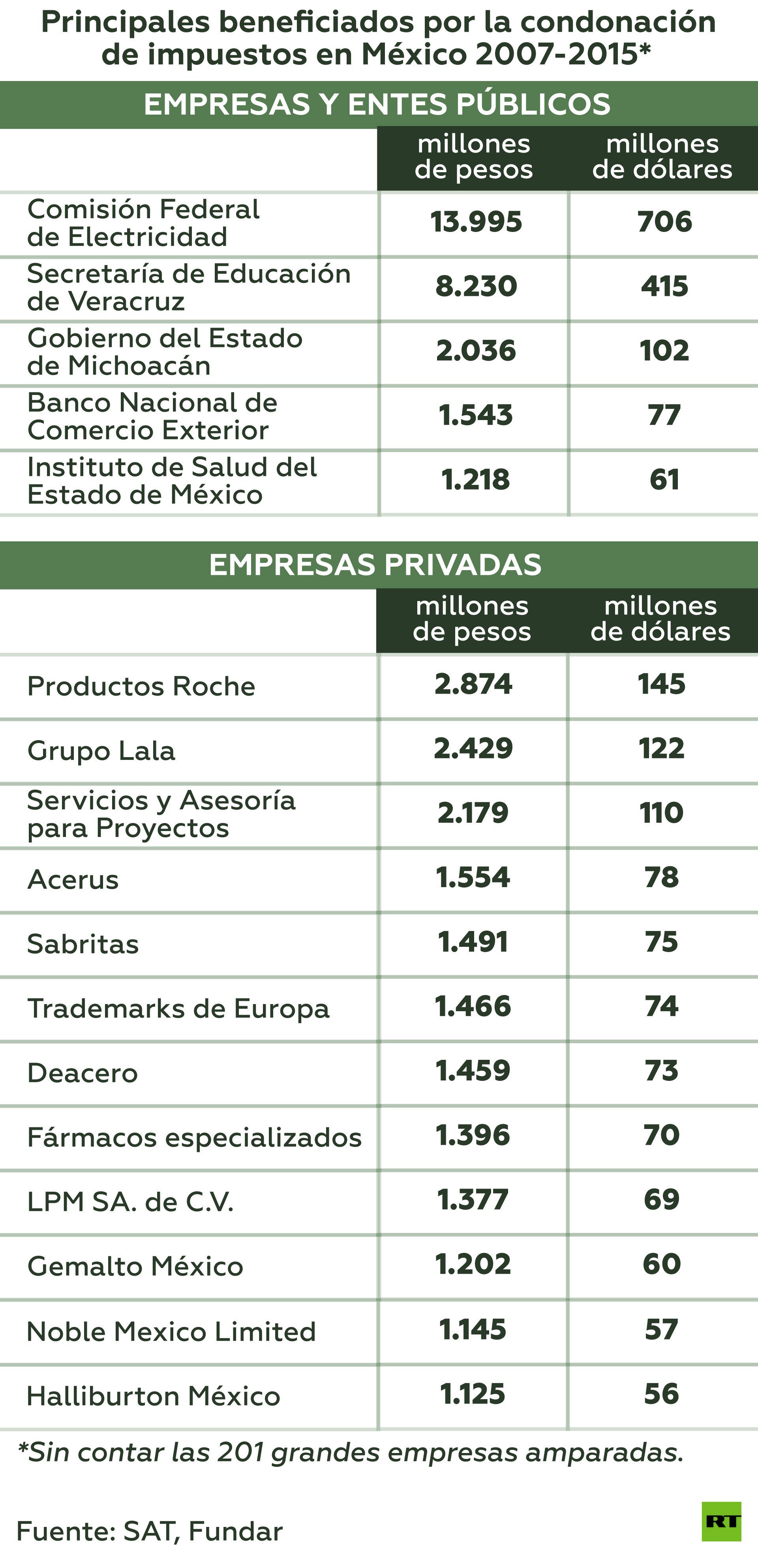 Tras más de una década de batalla legal, finalmente se revelaron algunos nombres de empresas, políticos y artistas que fueron beneficiados por el perdón y la suspensión de impuestos durante los mandatos de los expresidentes Felipe Calderón y Peña Nieto, quienes dejaron de recaudar un monto de 745.079 millones de pesos (37.597 millones de dólares) de manera opaca.