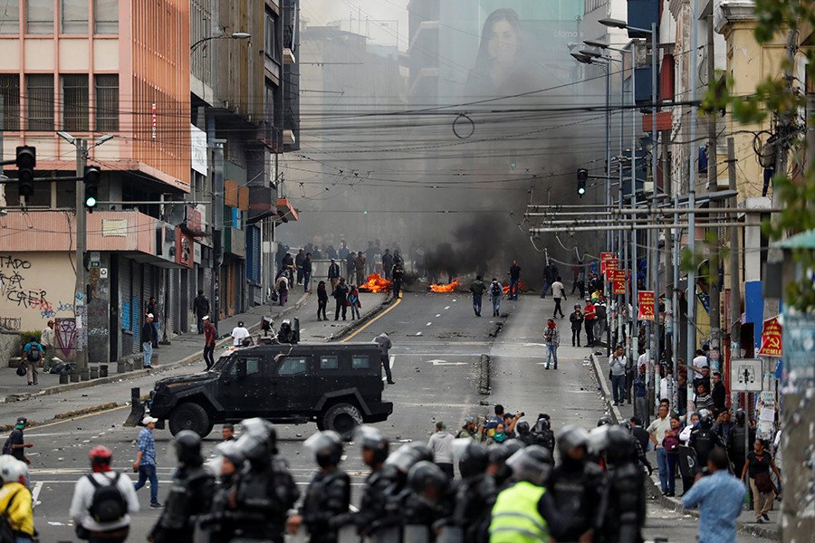 Pueblos indígenas y fuerzas armadas chocan en Ecuador durante una marchaCientos de indígenas y agricultores se enfrentaron con las fuerzas de seguridad ecuatorianas mientras marchaban hacia la capital, Quito, para protestar contra el aumento de los precios del combustible pic.twitter.com/8cwXw5xenA
