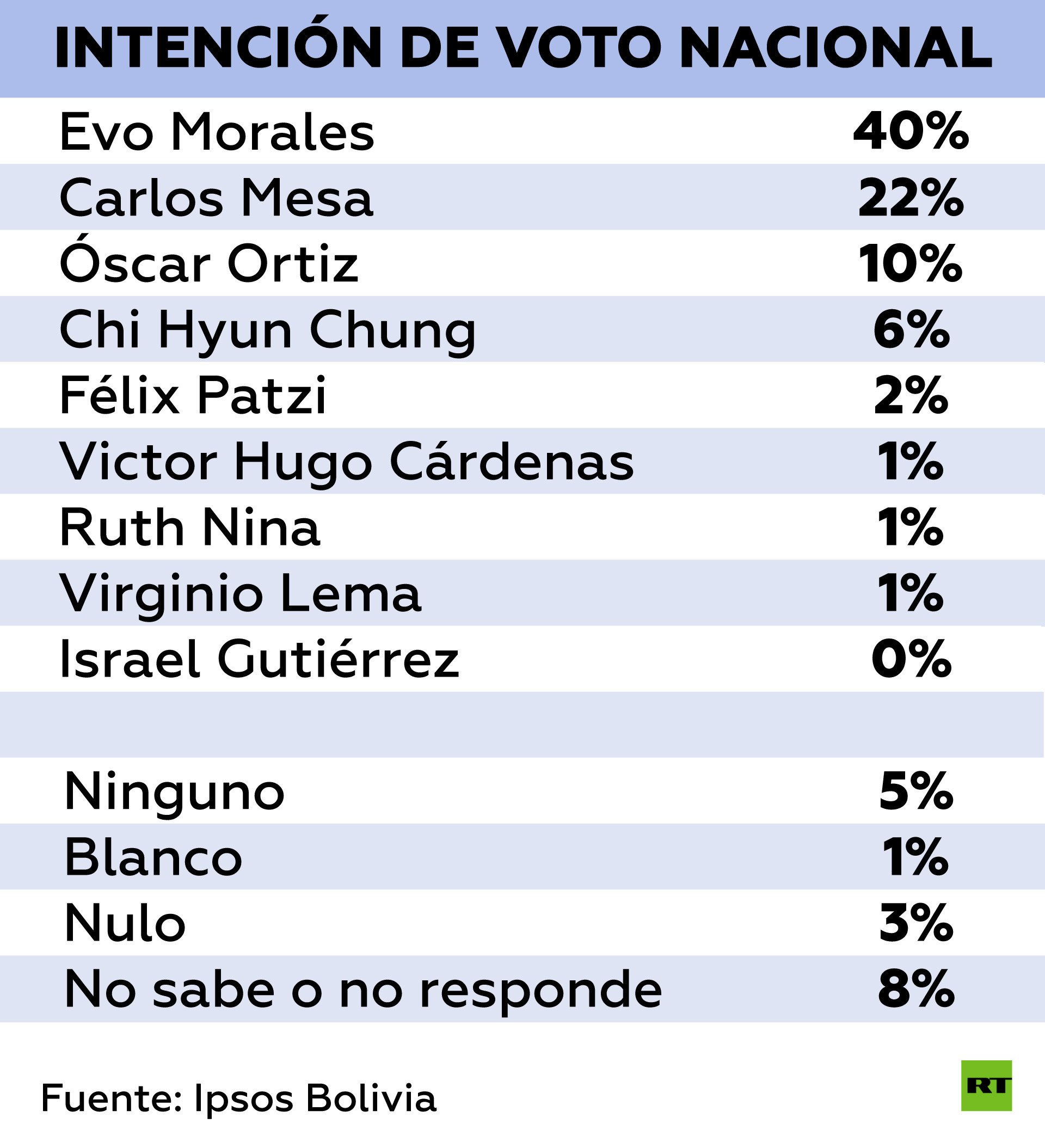 Según la encuesta más reciente publicada en Bolivia, Morales lidera con un 40 por ciento la intención de voto. Segundo llega Mesa, con el 22 por ciento. Es el resultado de un estudio hecho por Ipsos Bolivia para Radio Televisión Popular y La Razón. Consultaron a 2300 personas entre 18 y 70 años en 60 ciudades y poblaciones del país.