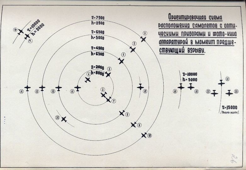 En un esbozo, se detalla la ubicación de los aviones que registraron la explosión. Según el esquema, fue vigilada por 28 aeronaves que estaban a distancias: entre menos de 2 y 15 kilómetros del epicentro.