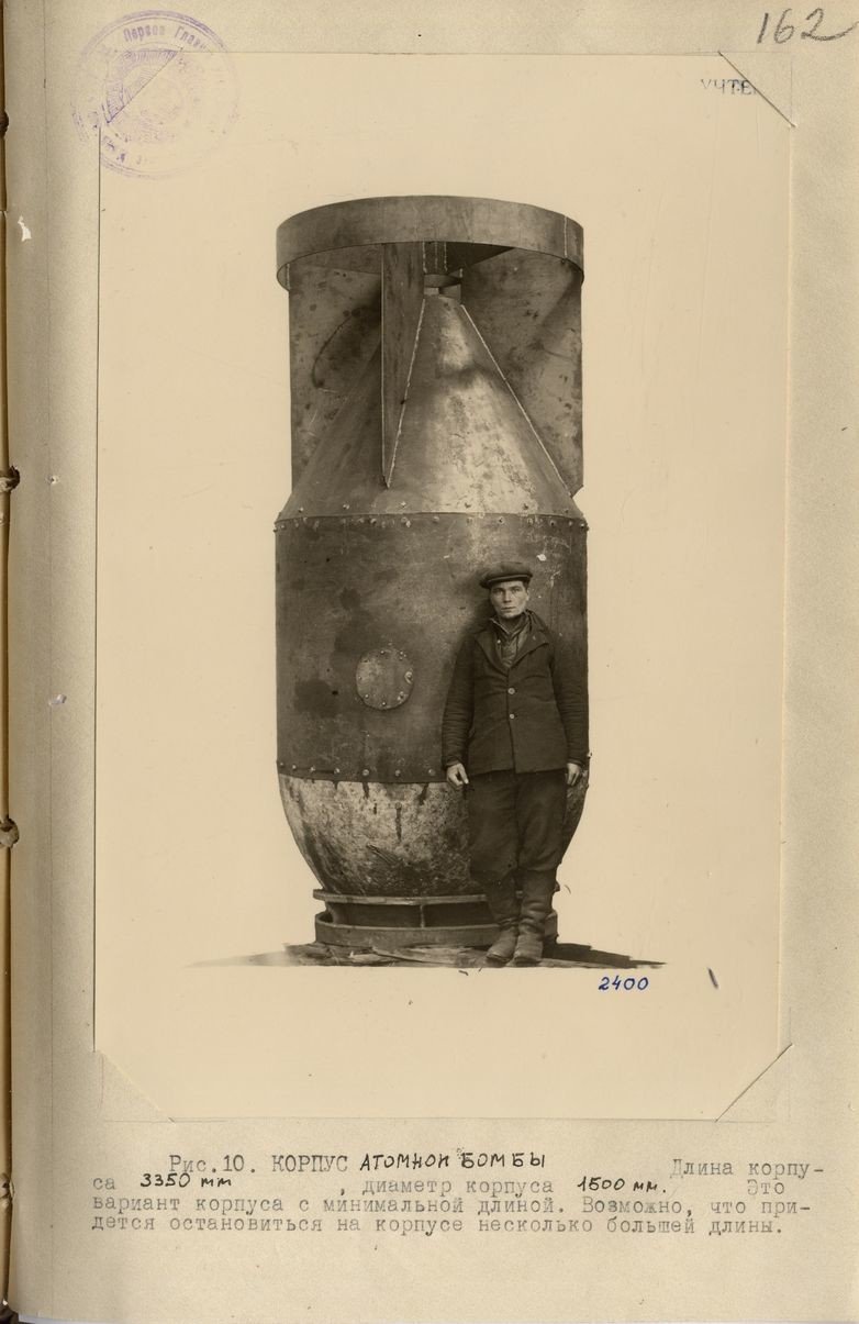 Asimismo, hay una serie de fotografías en las que aparece el cuerpo inicial de la RDS-1, con una longitud de 3,35 metros. Siendo 35 centímetros menor que la versión definitiva, fue ensayada en el polígono de Semipalátinsk (Kazajistán) el 29 de agosto de 1949, cinco años después de los bombardeos atómicos de Hiroshima y Nagasaki realizados por EE.UU.