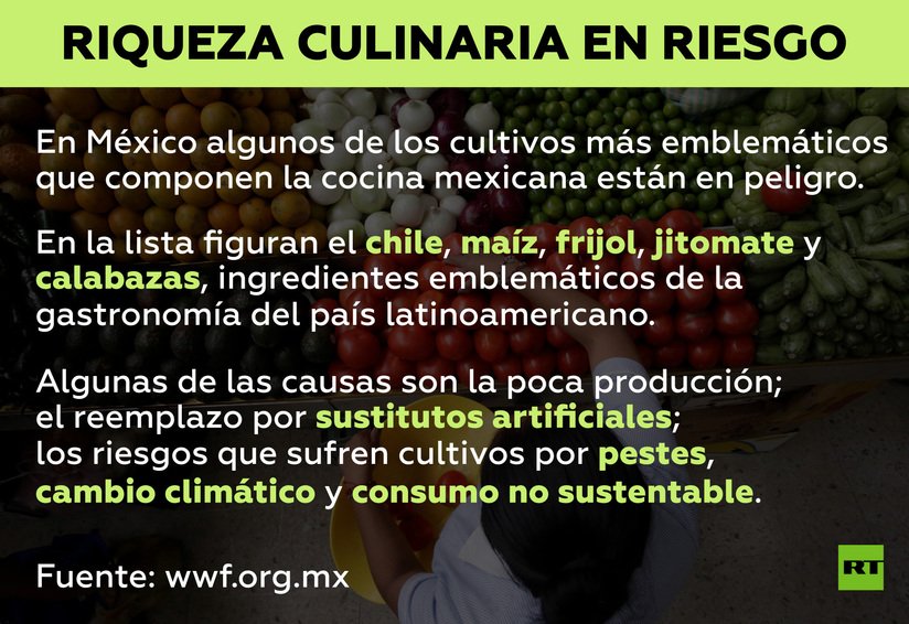 Chiles, maíces, frijoles, jitomates y calabazas, o platillos como el mole (una salsa hecha principalmente a base de chiles y especias) y el chile en nogada, podrían desaparecer, entre otros motivos, por los cambios en los hábitos de consumo, las dificultades en su cultivo, el cambio climático y la invasión de productos extranjeros.