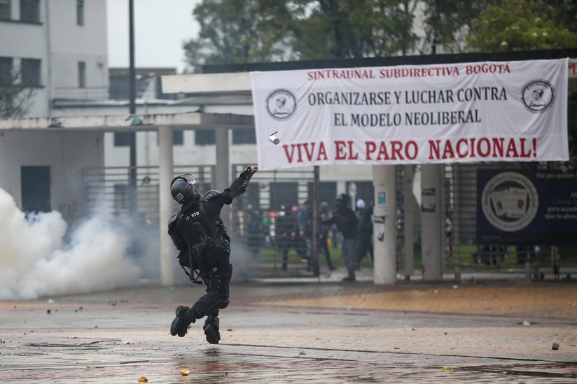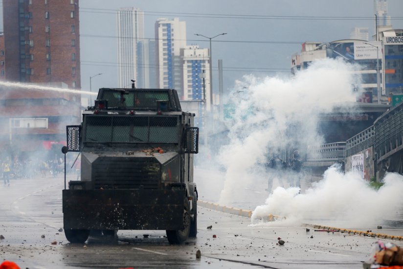 En el marco de la huelga y múltiples protestas que se llevan a cabo en Colombia, en la capital, Bogotá, la Policía ha dispersado a grupos de manifestantes con gases lacrimógenos en la plaza Bolívar, centro de la ciudad.