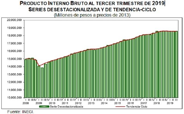 La economía mexicana estuvo en recesión técnica en la primera mitad del año, revelan cifras corregidas del Producto Interno Bruto (PIB) dadas a conocer este lunes por el Instituto Nacional de Estadística y Geografía (Inegi), que informó que en el cuarto trimestre de 2018 y en los primeros seis meses del 2019 se registraron caídas continuas de 0,1%.