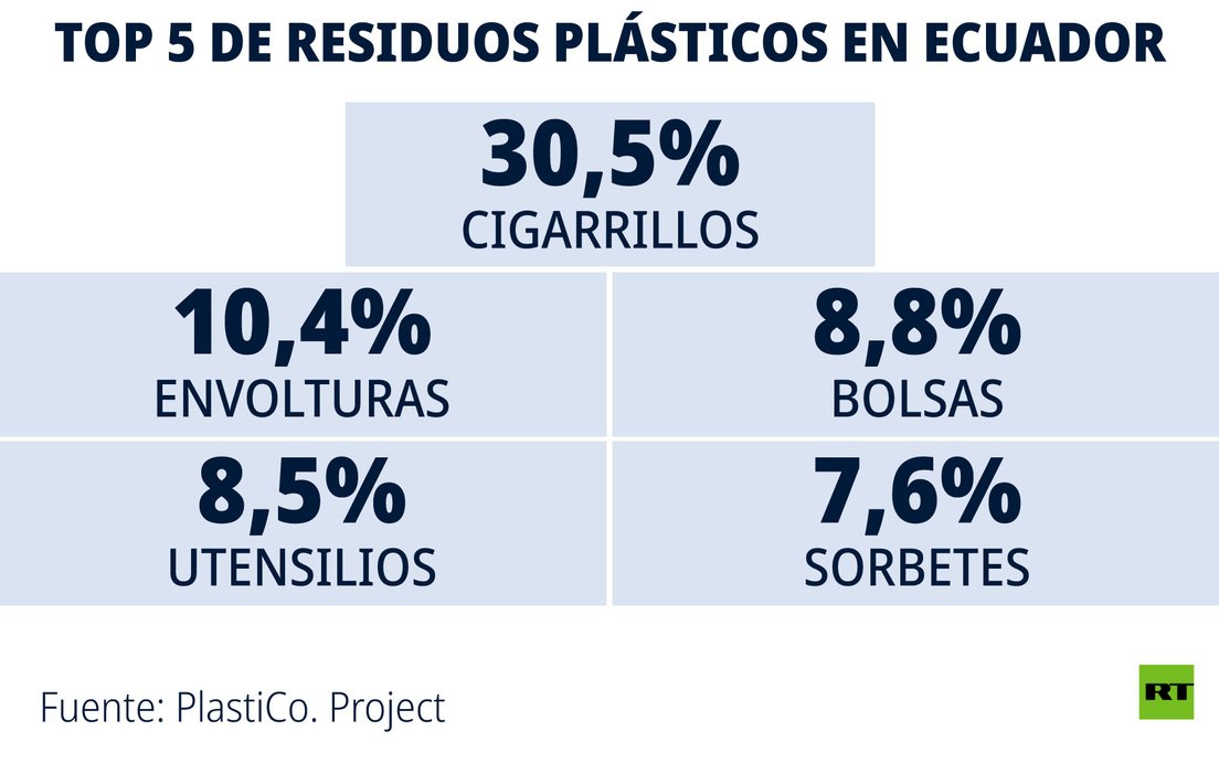 Esas limpiezas les han servido, además, para tener datos concretos de la basura que se produce en el país; a partir de ello, han elaborado el "Top 5" de los residuos plásticos más encontrados en Ecuador: cigarrillos (sus filtros están hechos de plástico denominado acetato de celulosa), envolturas, bolsas, utensilios y sorbetes.