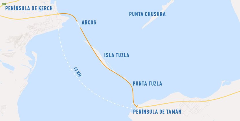 • 19 kilómetros de vías: 6 de ellos están sobre las aguas del estrecho de Kerch, el resto, incluyendo la isla de Tuzla en medio del estrecho, sobre tierra