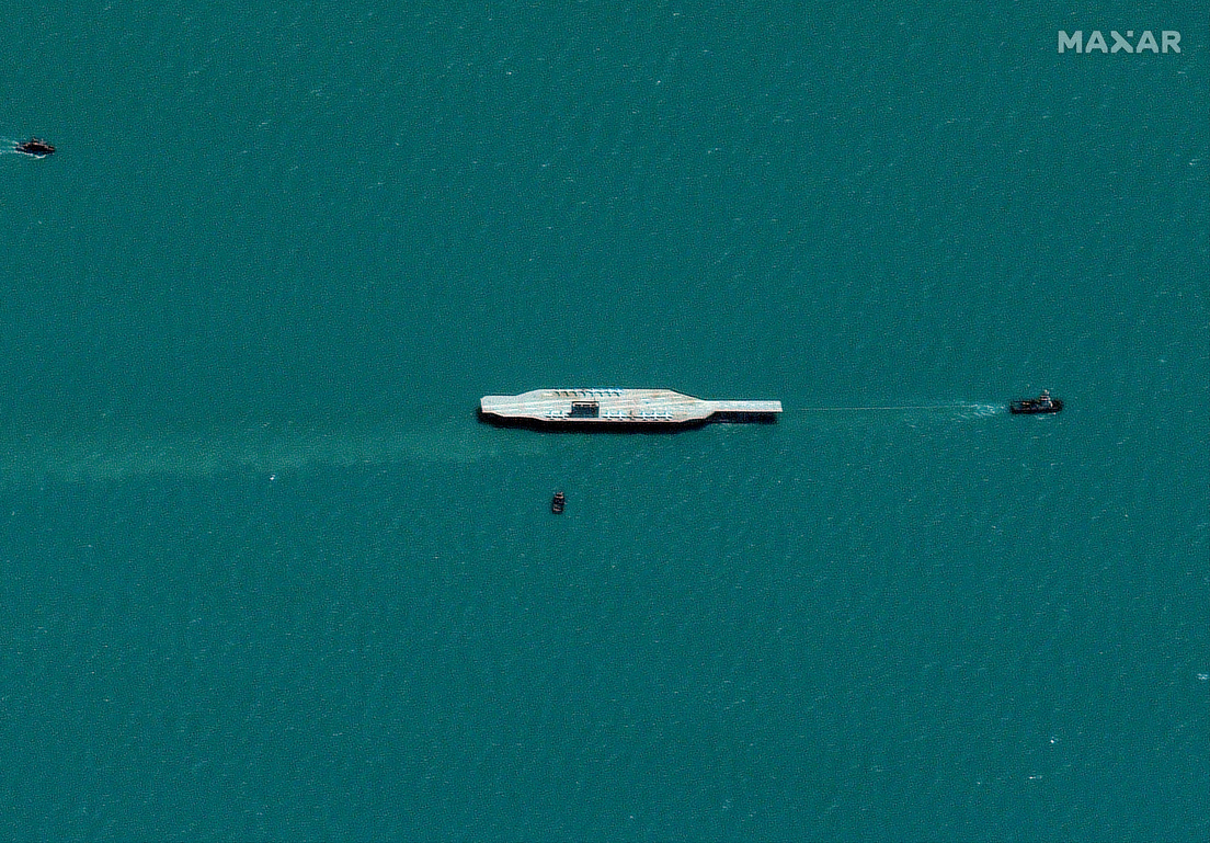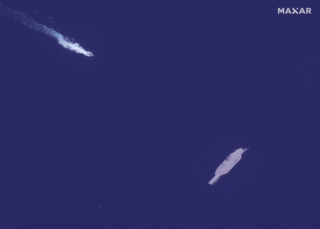 Una de las imágenes, tomadas el 26 de julio por la empresa estadounidense Maxar Technologies, muestra una lancha rápida iraní avanzando hacia la maqueta en aguas del estrecho, mientras que en otras fotografías se aprecian aviones simulados alineados en la cubierta del falso portaaviones.