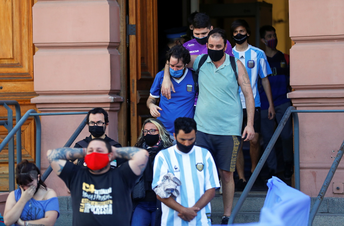 Muchos entran agitando canciones de cancha, pero salen sin energía, a lágrima viva. No soportan la impresión de confirmar que sí, su Diego está muerto. Conocidos y desconocidos vestidos con camisetas de distintos equipos se consuelan con un abrazo, con una palmada en el hombro, en la espalda. Hoy no es día de rivalidades.