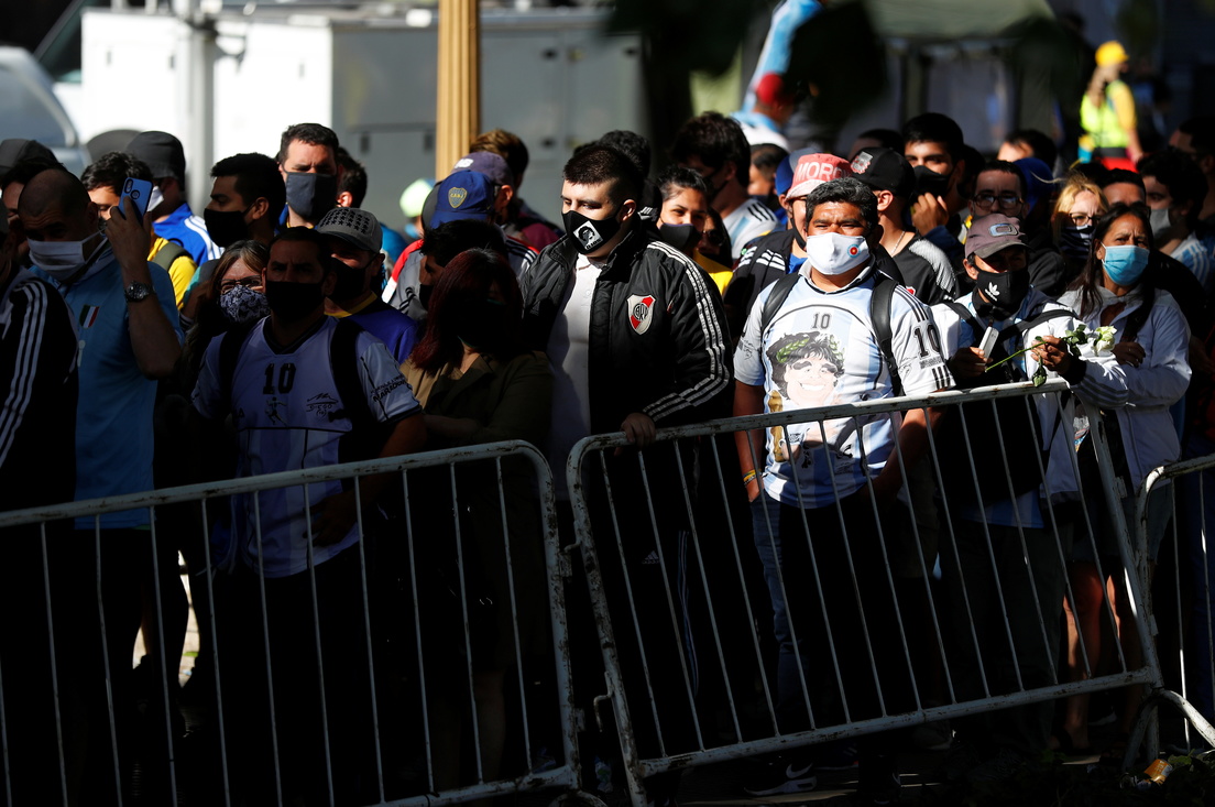 Una señora llora a los gritos. Un joven pide permiso para aventar un ramito de flores. Otro, una camiseta de la Selección. Hay personas solas, parejas, hombres y mujeres con sus hijos, grupos de amigos. En menos de una hora, a los pies del ataúd ya hay un mar de remeras, banderas, rosas y claveles. Los hinchas siguen pasando. Avientan besos, aplauden, muestran el puño en alto, se tocan el corazón, se arrodillan. Lloran.