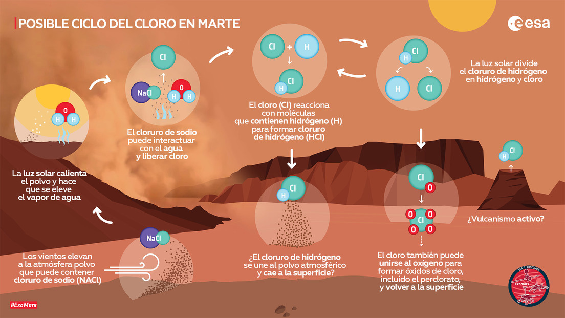 En un proceso muy similar al observado en la Tierra, las sales en forma de cloruro de sodio -restos de océanos evaporados e incrustados en la polvorienta superficie de Marte- son elevadas a la atmósfera por los vientos. La luz del Sol calienta la atmósfera haciendo que el polvo, junto con el vapor de agua liberado de las capas de hielo, se eleve y el polvo salado reacciona con el agua atmosférica liberando cloro, que a su vez reacciona con moléculas que contienen hidrógeno y crea el cloruro de hidrógeno.