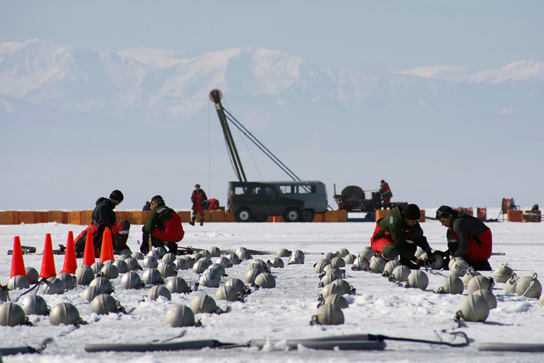 Es por eso que la probabilidad de que un neutrino, o incluso un gran número de neutrinos, choque con un átomo es increíblemente pequeña. Pero con la ayuda de un gran detector y un enorme flujo de neutrinos, podríamos obtener una tasa de colisión bastante vigorosa, de varios casos por día, por hora o por minuto. Se espera que el telescopio del lago Baikal haga posible captar estos constantes flujos de neutrinos de alta energía provenientes del espacio profundo.
