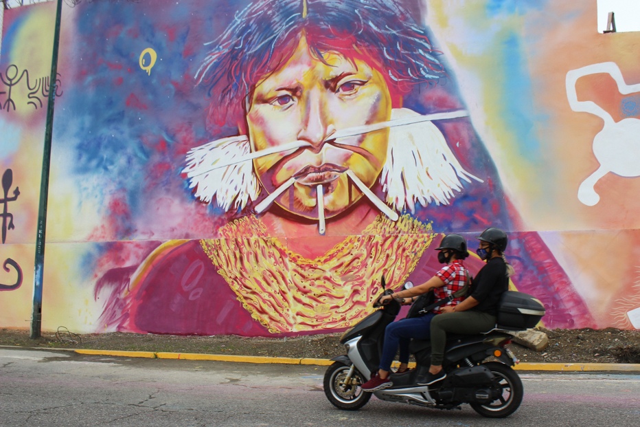Por estos días, en las vías rápidas de la ciudad hay algo más que carros y motos. En cada paredón hay decenas de jóvenes con chalecos fluorescentes y rostros pintados como indígenas amazónicos que trabajan hasta doce horas para culminar con el proyecto muralístico más grande de Venezuela.