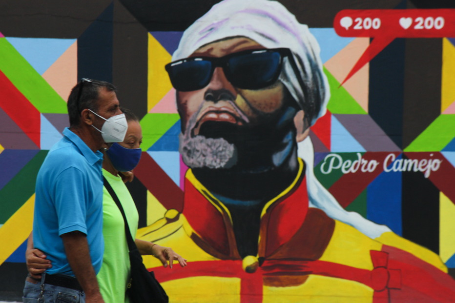 Víctor Rodríguez, el ilustrador y muralista conocido como 'Forastero', habla sentado mientras varias personas se acercan para preguntarle sigue. El día anterior se cayó de un andamio mientras pintaba la fachada de una casa en la plazoleta El afinque de Marín, en la parroquia San Agustín, un barrio caraqueño donde se respira la identidad cultural afrovenezolana.