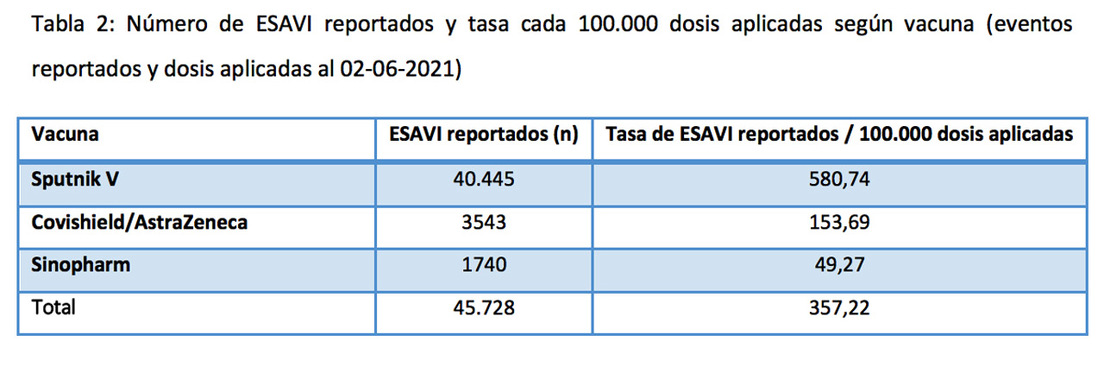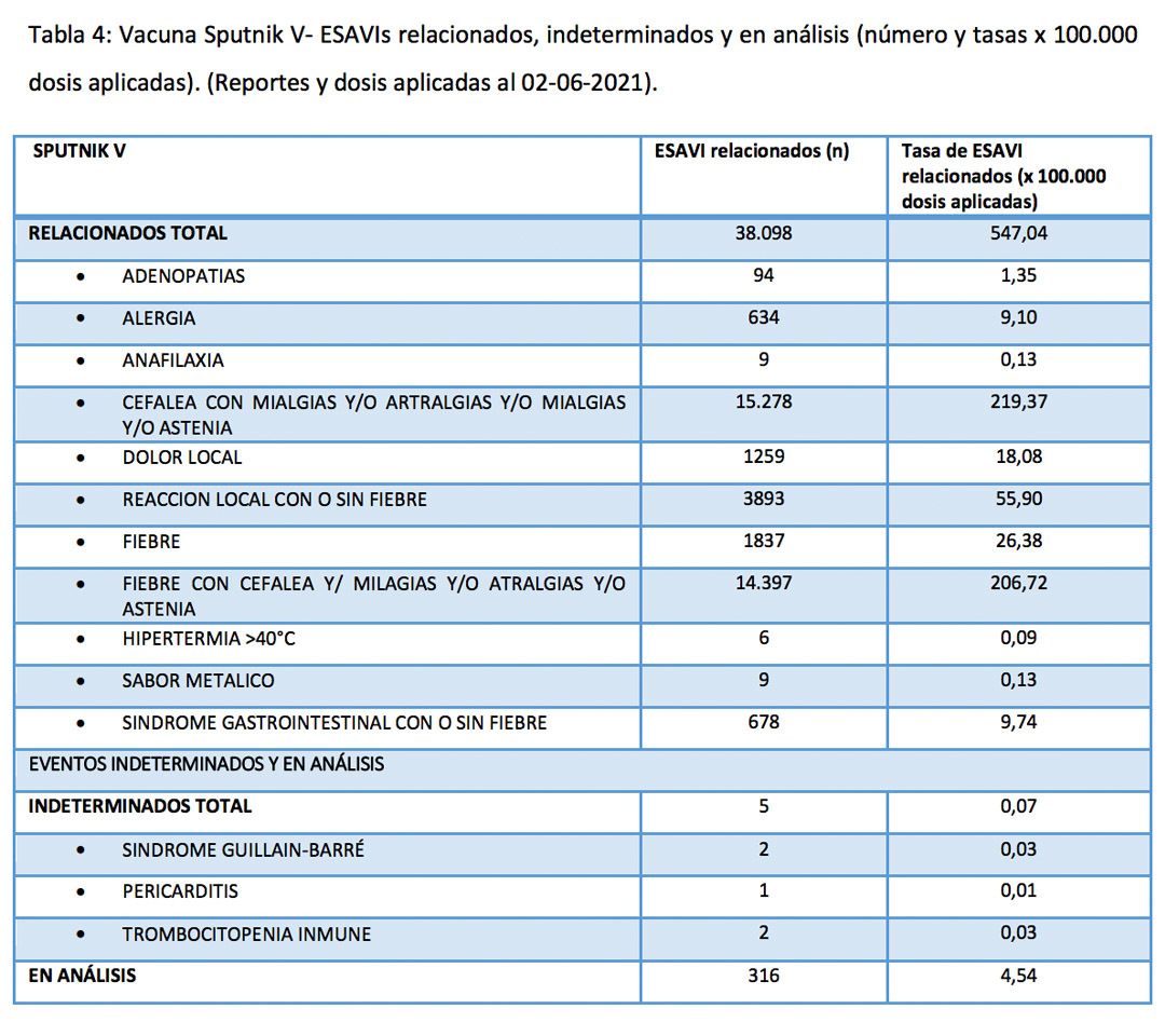 El informe recuerda que la vacunación con el antídoto ruso fue la primera en implementarse en el país sudamericano y es la vacuna más utilizada hasta la fecha. También hace hincapié en que, al inicio de una campaña de vacunación, en medio de una pandemia y ante la introducción de un nuevo fármaco, "es esperable que la sensibilidad del sistema de vigilancia sea muy alta".