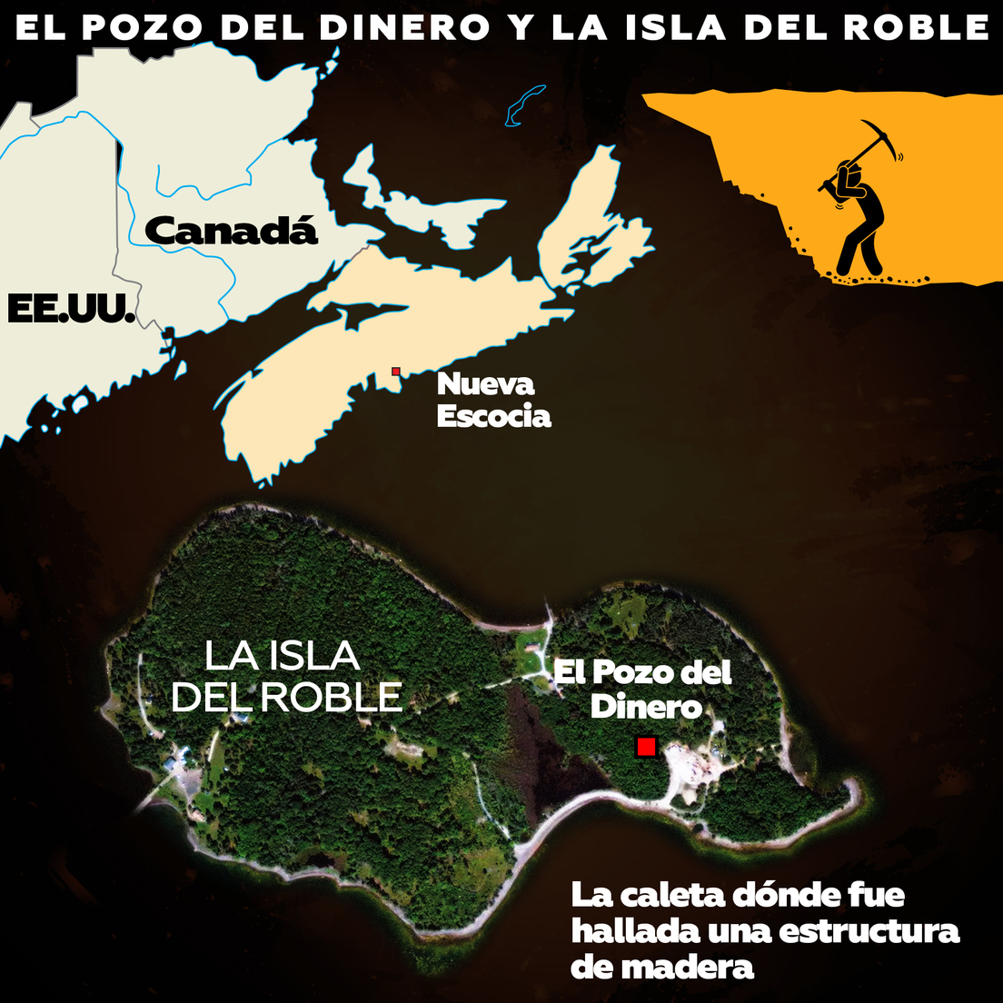 Un pozo todavía no estudiado completamente, de decenas de metros de profundidad. Varios exploradores muertos en el intento de hacerse con un enorme botín, supuestamente ocultado allí hace varios siglos. Hallazgos esporádicos que indican actividad humana en el lugar y una inscripción encriptada que señalaría la ubicación del oro. No es la trama de una nueva película de la saga de 'Indiana Jones', sino la historia de la pequeña Isla de Roble, ubicada frente a la costa de Nueva Escocia, en Canadá.
