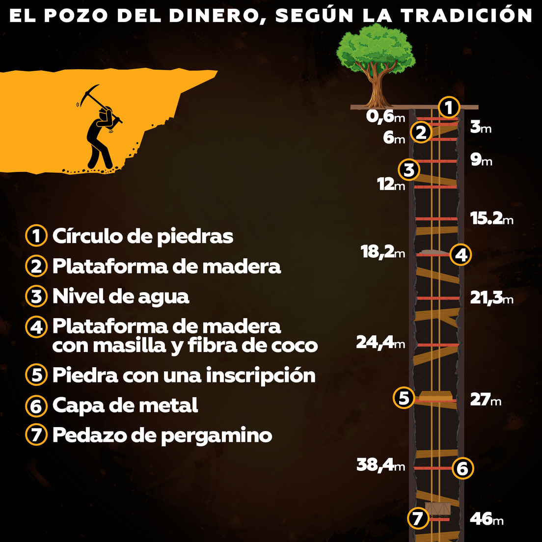 Según cuenta la tradición local registrada en 1929 por el periodista Charles B. Driscoll, el pozo fue descubierto por tres jóvenes leñadores en 1795. Aunque estaba cubierto, el lugar destacaba del entorno por una depresión circular. Tras cavar unos 60 centímetros, encontraron un círculo de piedras que bordeaban el pozo. Continuaron la exploración y hallaron una plataforma de madera que cerraba el pozo a una profundidad de tres metros. Otra plataforma similar fue encontrada a los seis metros. Al tropezar contra la estructura, los leñadores dejaron la búsqueda y se retiraron de la isla.