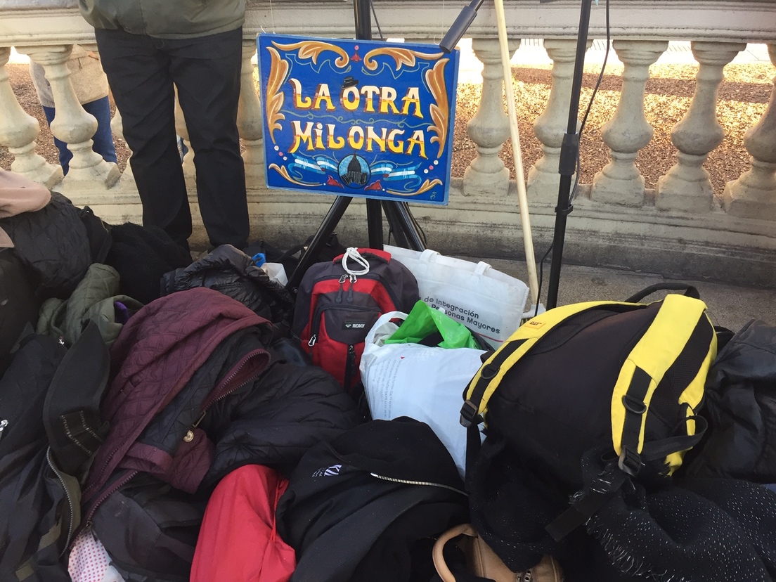 La maestra pone un parlante. Suenan los acordes de un tango clásico de Juan D'Arienzzo, pero el volumen es insuficiente. La música se confunde con las bocinas de los autos que pasan, los ladridos de los perros; los gritos de unas chicas trans que, a escasos metros, bailan vogue; o de los reguetoneros que tienen su propio espacio.