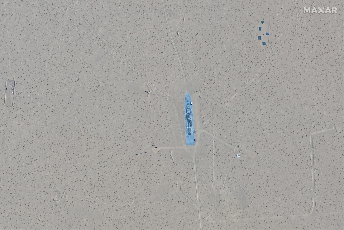 Imágenes obtenidas por satélite, proporcionadas por una empresa de tecnología espacial, muestran réplicas a gran escala de un portaaviones y de al menos dos destructores de misiles guiados de la clase Arleigh Burke, una de 75 metros de largo. Las maquetas están montadas sobre un extenso sistema de rieles.