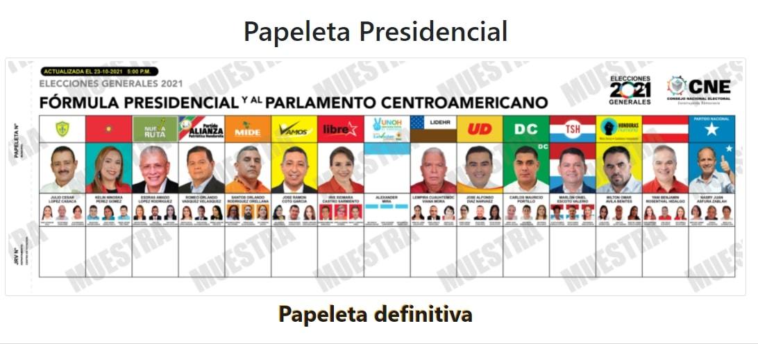 En la boleta aparecen 14 candidatos a la Presidencia, aunque solo dos aspirantes se perfilan como los favoritos. Por un lado, la candidata izquierdista de Libertad y Refundación (Libre), Xiomara Castro, esposa del expresidente Manuel Zelaya, quien fue depuesto mediante un golpe de Estado en 2009. Mientras que por parte del oficialista Partido Nacional se presentó el conservador Nasry 'Tito' Asfura, actual alcalde de la capital, Tegucigalpa.