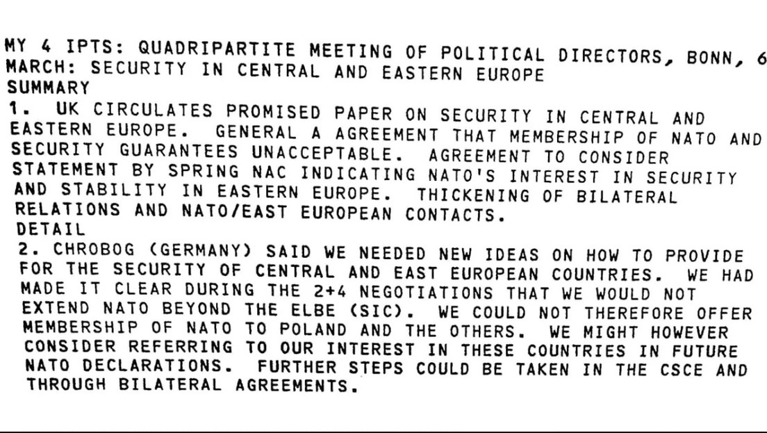 Según el documento desclasificado, durante otra reunión anterior, celebrada en 1990 en el formato de Dos más Cuatro entre la República Federal de Alemania (RFA) y la República Democrática Alemana (RDA), junto con Francia, la Unión Soviética, el Reino Unido y EE.UU. a fin de debatir el acuerdo final con respecto al futuro de Alemania, que fue firmado en Moscú a finales de ese año, las partes expresaron que la expansión de la coalición debía ser limitada.