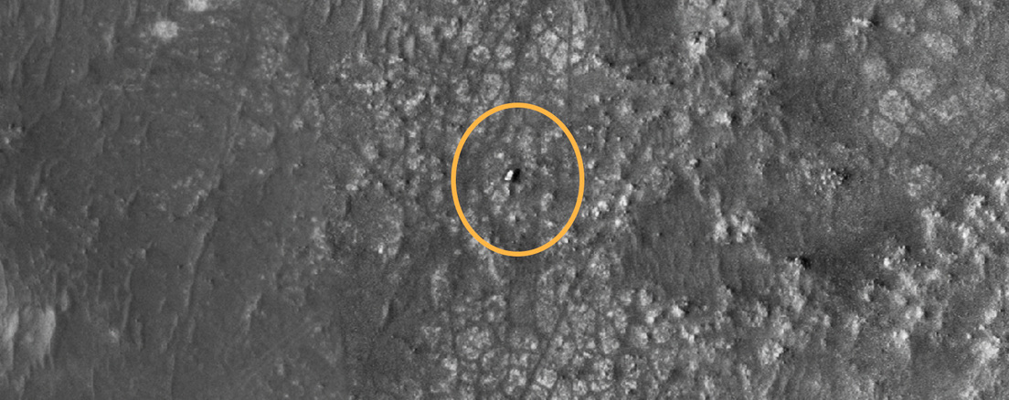 El equipo de cámaras MRO HiRise de la Universidad de Arizona (EE.UU.) compartió este jueves una foto tomada por el Orbitador de Reconocimiento de Marte de la NASA en la que es posible ver desde el espacio a un diminuto helicóptero autónomo Ingenuity reposando en la superficie del planeta rojo.