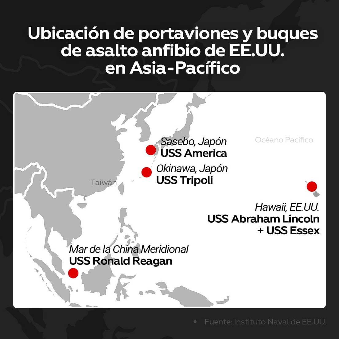 En concreto, se trata del portaviones de clase Nimitz de propulsión nuclear USS Ronald Reagan, que actualmente está en el mar de la China Meridional tras hacer una escala en Singapur la semana pasada, detalla el periódico con referencia a los datos de la organización no lucrativa Instituto Naval de EE.UU. Además, el buque de asalto anfibio USS Tripoli se encuentra cerca de la isla japonesa de Okinawa, mientras que el buque del mismo tipo USS America está desplegado en el puerto nipón de Sasebo.