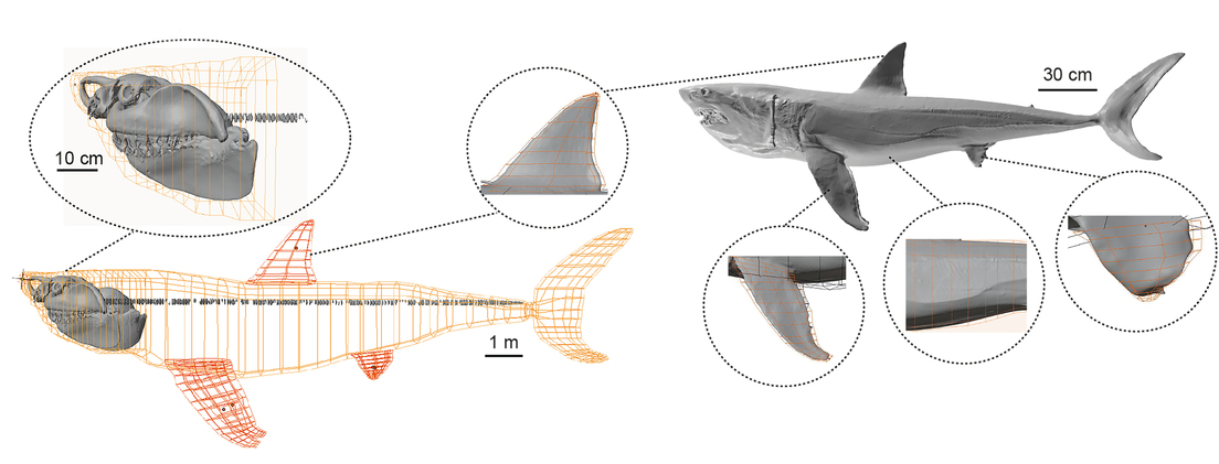 Posteriormente, se combinó los resultados con el escaneo 3D del cuerpo de grandes tiburones blancos, lo que permitió crear un modelo 3D avanzado de todo el cuerpo de un megadolón.