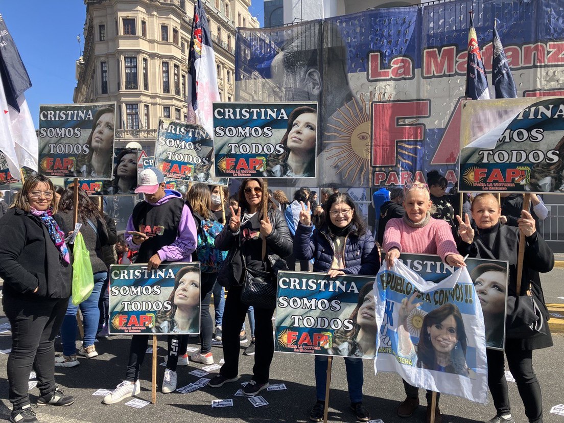 "Esto es culpa de los medios y del macrismo, llevan años repitiendo discursos de odio contra Cristina", acusa un señor sesentón que, al centro de la Plaza, enarbola una bandera que lleva plasmado el rostro de Fernández de Kirchner.