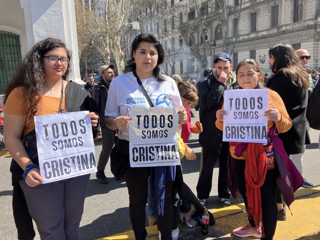La denuncia se repite en carteles que exigen "basta de violencia desde los medios de desinformación", en testimonios que recuerdan las manifestaciones antiperonistas que han mostrado deseos y amenazas de muerte para la vicepresidenta, ya sea con horcas, guillotinas, bolsas mortuorias, fusiles o bombas, y que han sido replicados de manera permanente en las redes sociales sin condena alguna por parte de la oposición.