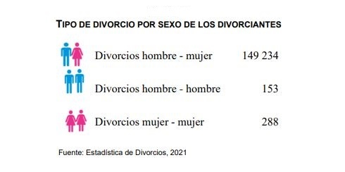 En el caso de los matrimonios conformados por personas del mismo sexo, las estadísticas indican durante 2021 se disolvieron 153 de hombres y 288 de mujeres.