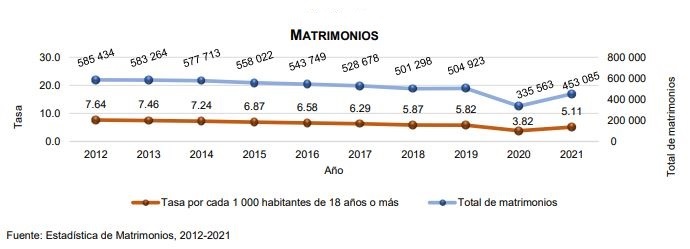 En contraparte, cifras del INEGI arrojan que durante 2021 se registraron 453.085 matrimonios, un incremento de 35% respecto a 2020. No obstante, cabe destacar que, si bien en los últimos años se ha mantenido una tasa promedio de parejas que deciden unir sus vidas legalmente, la tendencia es a disminuir.