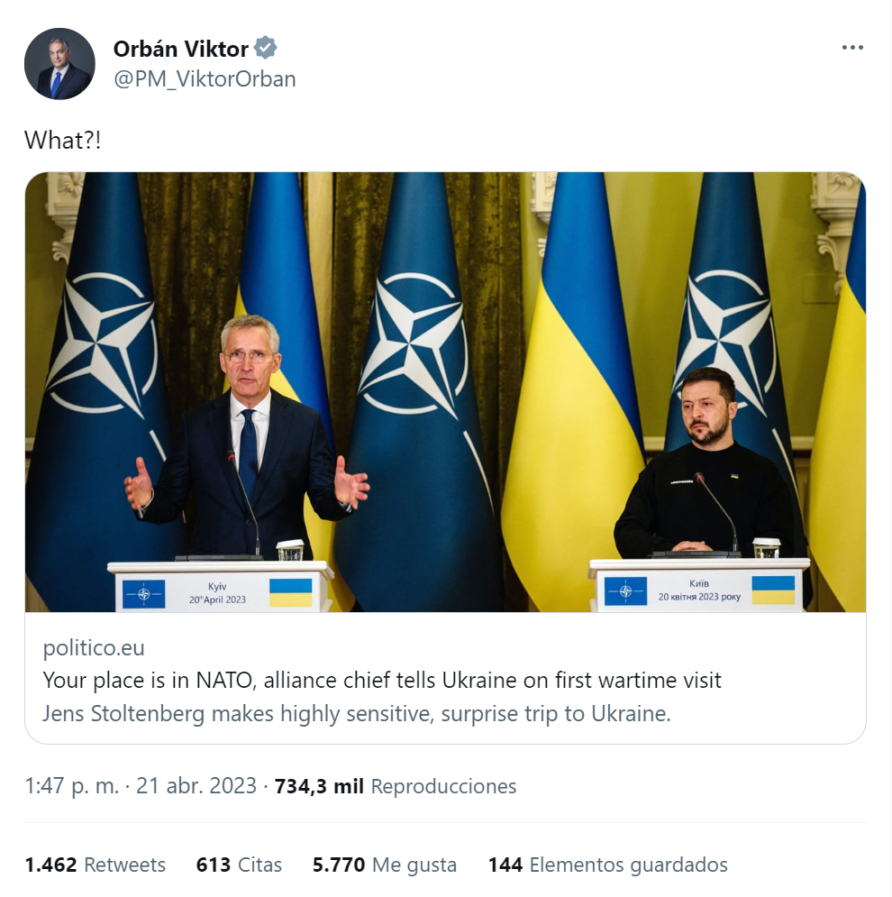 "¡¿Qué?!", escribió este viernes Orbán en su cuenta de Twitter al comentar las declaraciones de Stoltenberg.