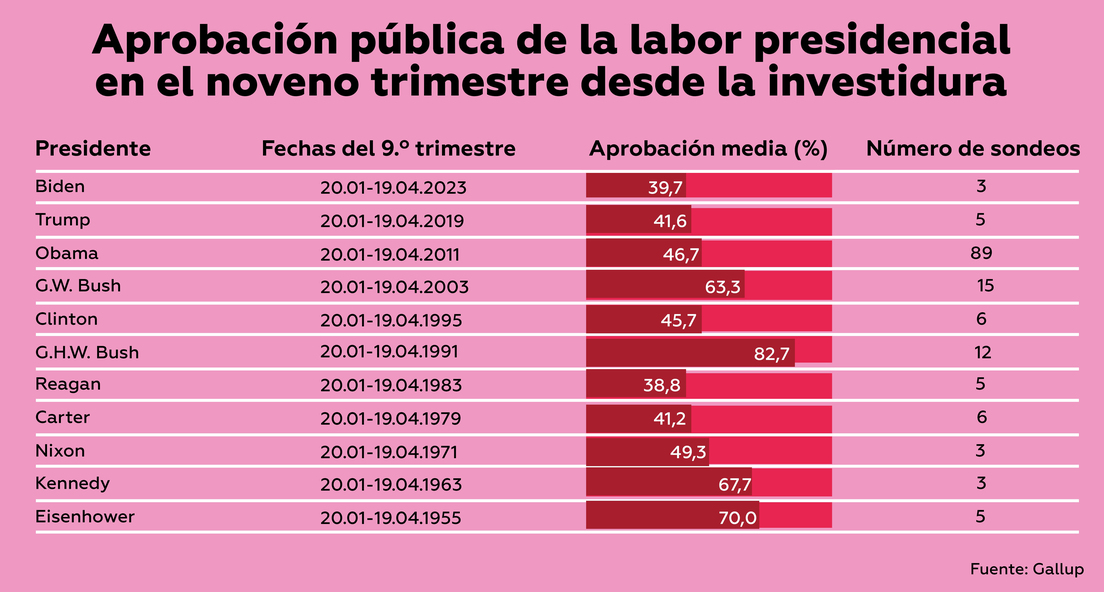 La encuestadora también estableció la cifra de aprobación media para el noveno trimestre del mandato de Biden (de enero a abril de 2023), que se ubicó en el 39,7 %. El punto más alto se registró poco después de la investidura de Biden, cuando su índice de aceptación llegó al 57 %.