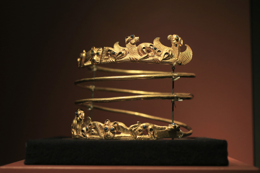 Las piezas fueron expuestas en el Museo arqueológico de Allard Pierson de Ámsterdam entre febrero y agosto de 2014. La colección incluye un casco de oro, una espada con su vaina, un altar pintado procedente del enterramiento del rey escita Skilur, una estatua de una diosa escita, así como cajas de laca, joyas y otros objetos.