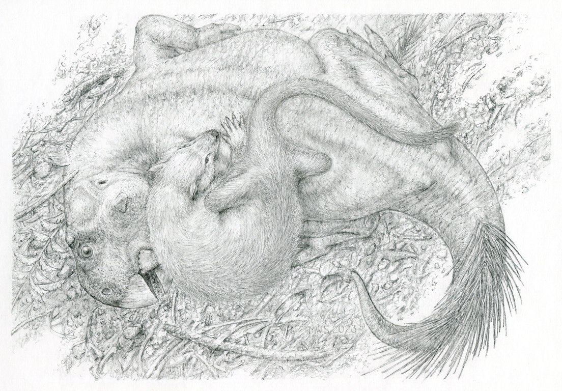 En este sentido, indicó que el fósil en cuestión podría mostrar el momento en el que el Repenomamus se estaba comiendo al Psittacosaurus mientras aún estaba vivo, antes de morir ambos sepultados repentinamente por algún deslizamiento de tierra y de escombros tras una erupción volcánica.