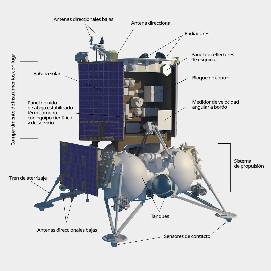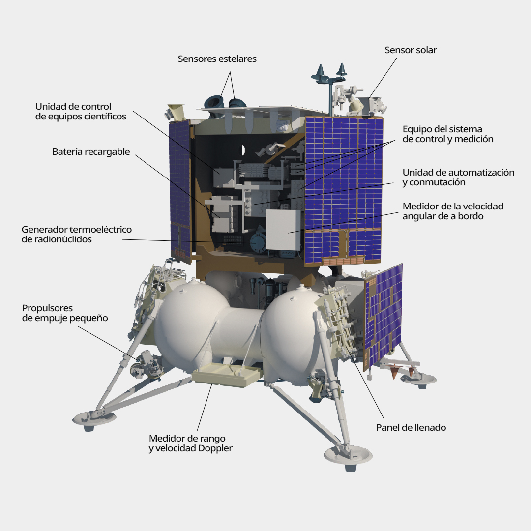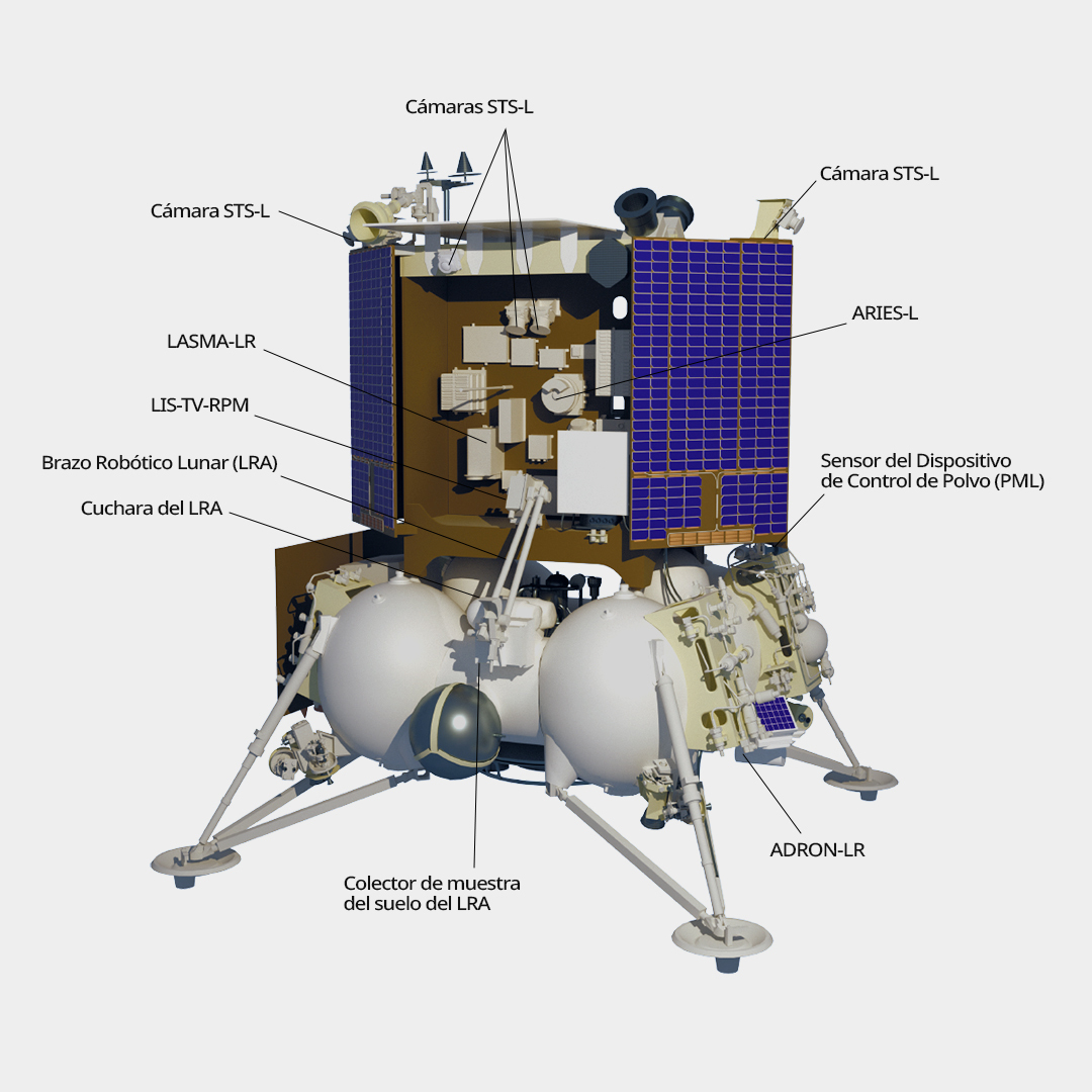 Se trata del módulo de aterrizaje automático Luna-25, que tendrá la tarea científica de estudiar la composición del suelo del satélite natural de la Tierra, así como analizar los componentes de polvo y plasma de su exósfera.