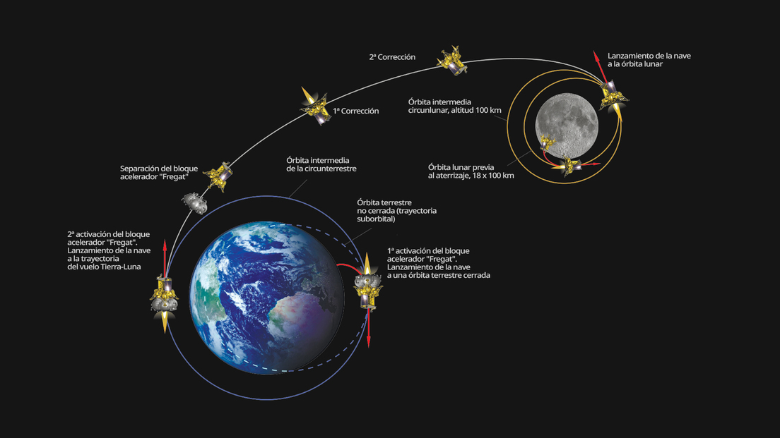 Para llegar a su destino y llevar a cabo sus tareas científicas, Luna-25 deberá completar varias etapas de vuelo. En primer lugar, el cohete Soyuz 2.1b colocará al Fregat en la órbita terrestre. Posteriormente, esta etapa superior entrará en una órbita de transferencia lunar. A una distancia de 3.000 kilómetros de la Tierra, el Fregat se separará de Luna-25 para que esta continúe con su trayectoria.