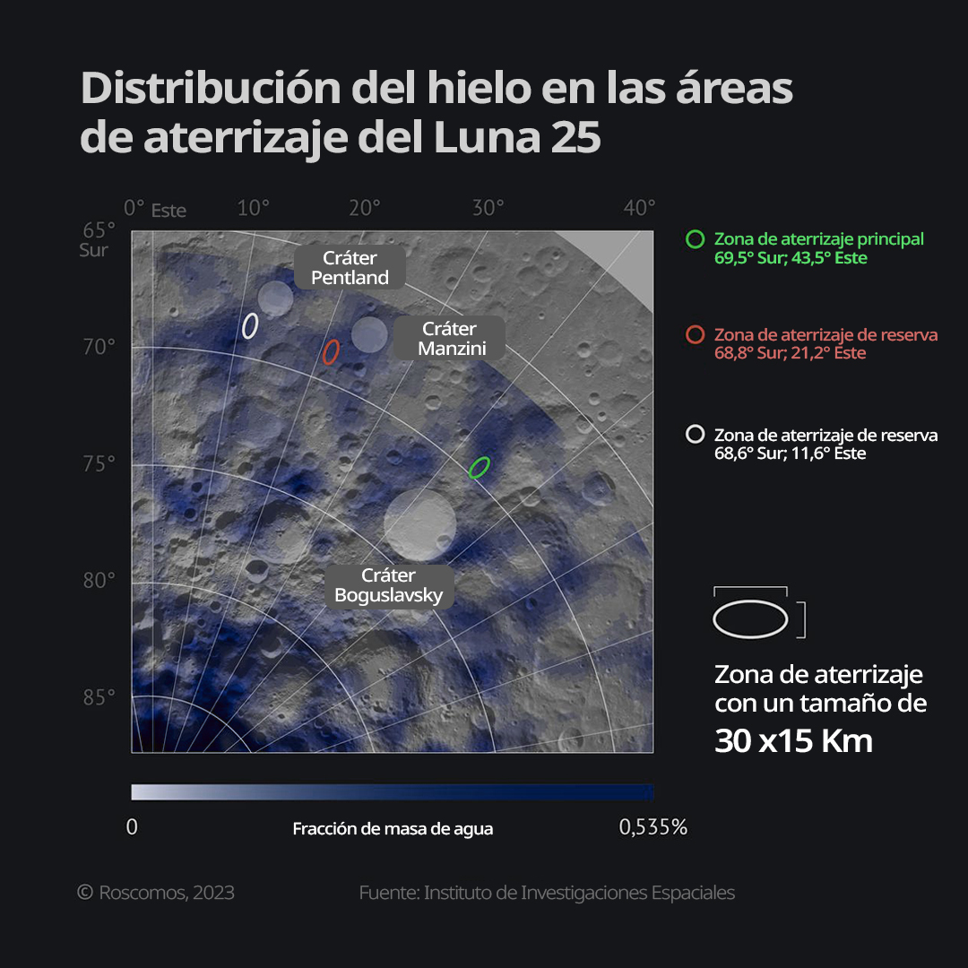 Estas zonas de aterrizaje tienen forma elíptica, con ejes de 15 por 30 kilómetros, con el fin de que Luna-25 no vaya a volcarse al momento de descender.