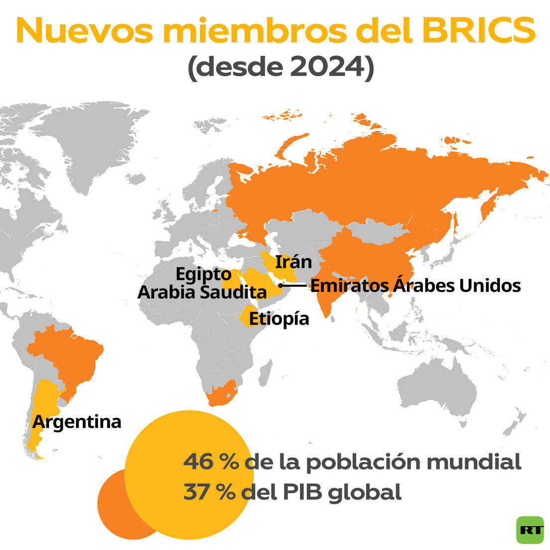 Cabe mencionar que desde enero de 2024 el BRICS dará la bienvenida a seis nuevos socios: Argentina, Egipto, Irán, Emiratos Árabes Unidos, Arabia Saudita y Etiopía. Tras la ampliación, el PIB de los BRICS será el 37 % del PIB mundial, y el grupo representará al 46 % de la población global.