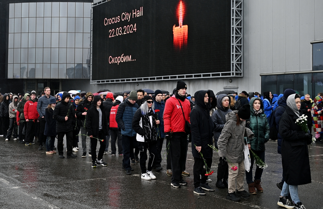Largas colas de ciudadanos que portan flores y desean honrar la memoria de las víctimas se han formado frente a la sala de conciertos Crocus City Hall, incendiada en el atentado terrorista.