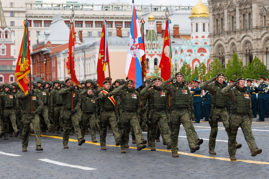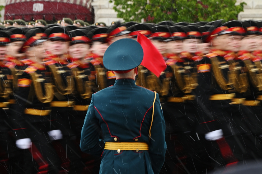 Columnas militares formadas por regimientos y batallones de las Fuerzas Armadas rusas, así como unidades participantes en la operación militar especial, desfilaron por la Plaza Roja. Además, en el desfile participaron cadetes de varias escuelas militares, unidades de personal militar femenino, cosacos y una orquesta militar.