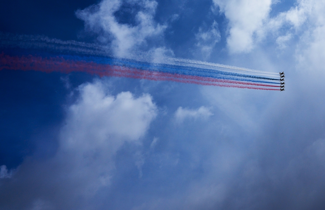 El acto culminó con los vuelos de aviones de ataque Su-25BM, así como de cazas Su-30SM y MiG-29 de los equipos de acrobacia aérea Russkie Vítiazi y Strizhí.