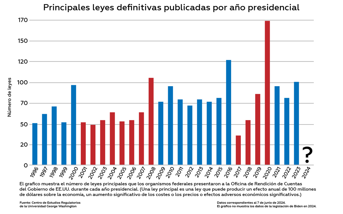 Mientras tanto, según la estadística del centro de Estudios Regulatorios de la Universidad George Washington, se puede ver el auge significativo en el número de leyes publicadas por varias administraciones estadounidense en el último año de su mandato. El grafico refleja el número de leyes principales que los organismos federales presentaron a la Oficina de Rendición de Cuentas del Gobierno de EE.UU. durante cada año presidencial. De acuerdo con la Ley de Revisión del Congreso, una ley principal es una ley que puede producir un efecto anual de 100 millones de dólares sobre la economía, un aumento significativo de los costes o los precios o efectos adversos económicos significativos.