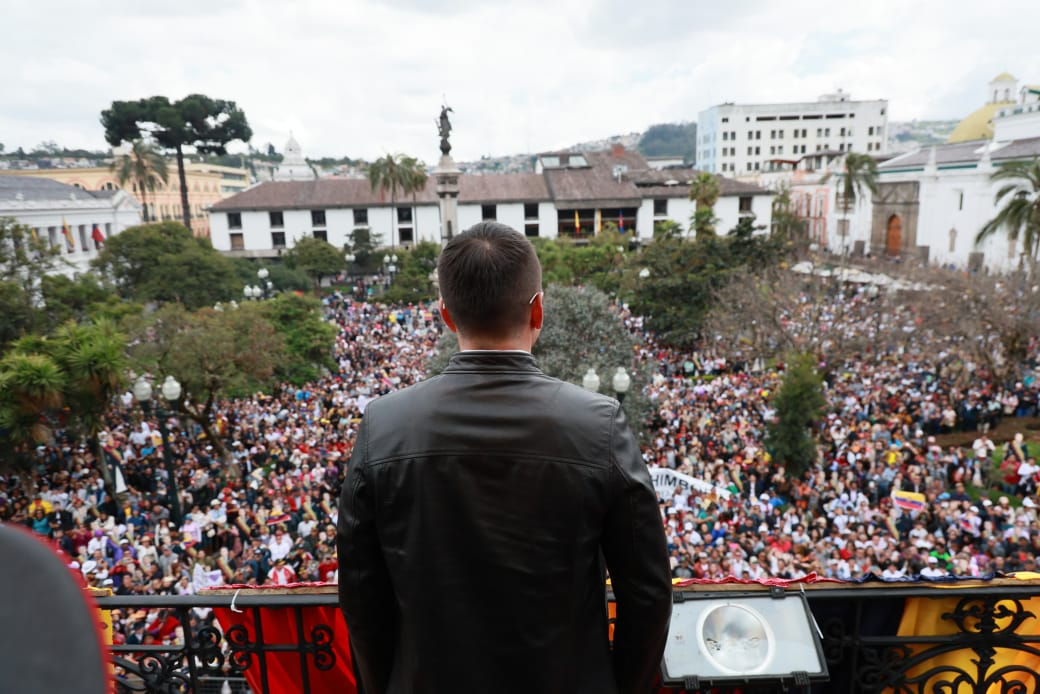 Daniel Noboa, el actual mandatario y quien busca la reelección, ofreció un discurso el domingo ante simpatizantes que se congregaron frente al Palacio de Carondelet —sede del Ejecutivo— en Quito.
