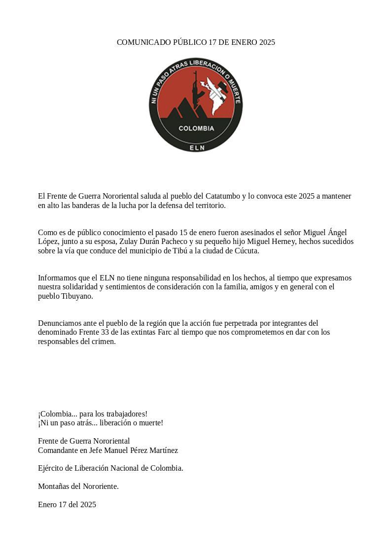 A través de un comunicado difundido en sus redes, el Frente de Guerra Nororiental del ELN indicó que los asesinatos de Miguel Ángel López, su esposa, Zulay Durán Pacheco y el hijo de ambos, Miguel Herney, fueron perpetrados el pasado 15 de enero "por integrantes del denominado Frente 33 de las extintas FARC".