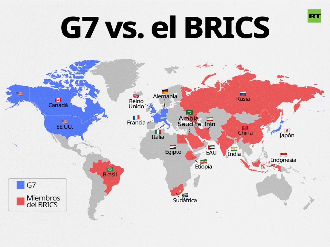 - Los analistas de Bloomberg sugieren que para 2040 la cuota de los BRICS en el PIB mundial crecerá hasta el 45 %, mientras que la del G7 caerá hasta el 20 %. Así, como señala la agencia, ambas formaciones "habrán intercambiado su tamaño relativo entre 2001 y 2040".