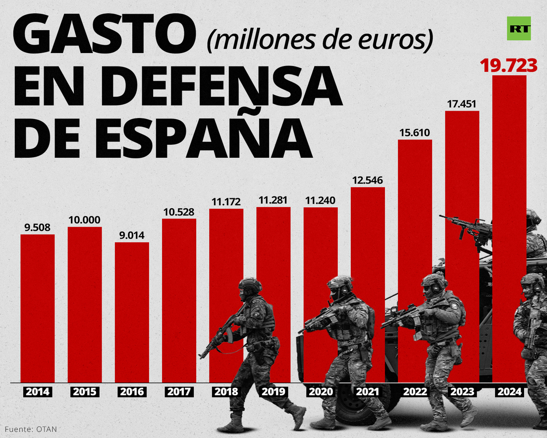Lo cierto es que España ha incrementado esta partida en 8.483 millones de euros en cuatro años (un 75,5%). Según los datos de la OTAN, en 2020 se alcanzaron los 11.240 millones de euros, mientras que se pasó de 12.546 millones en 2021 a 15.610 millones en 2022, todo ello con el Gobierno de coalición entre PSOE y Unidas Podemos (la coalición de Podemos e Izquierda Unida).